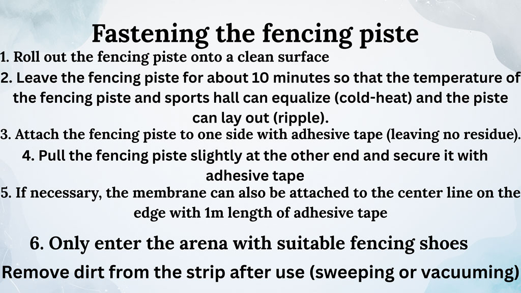 - Textile fencing pistes may only be used for practicing the sport of fencing according to the rules of the international FIE or the respective national fencing federation.