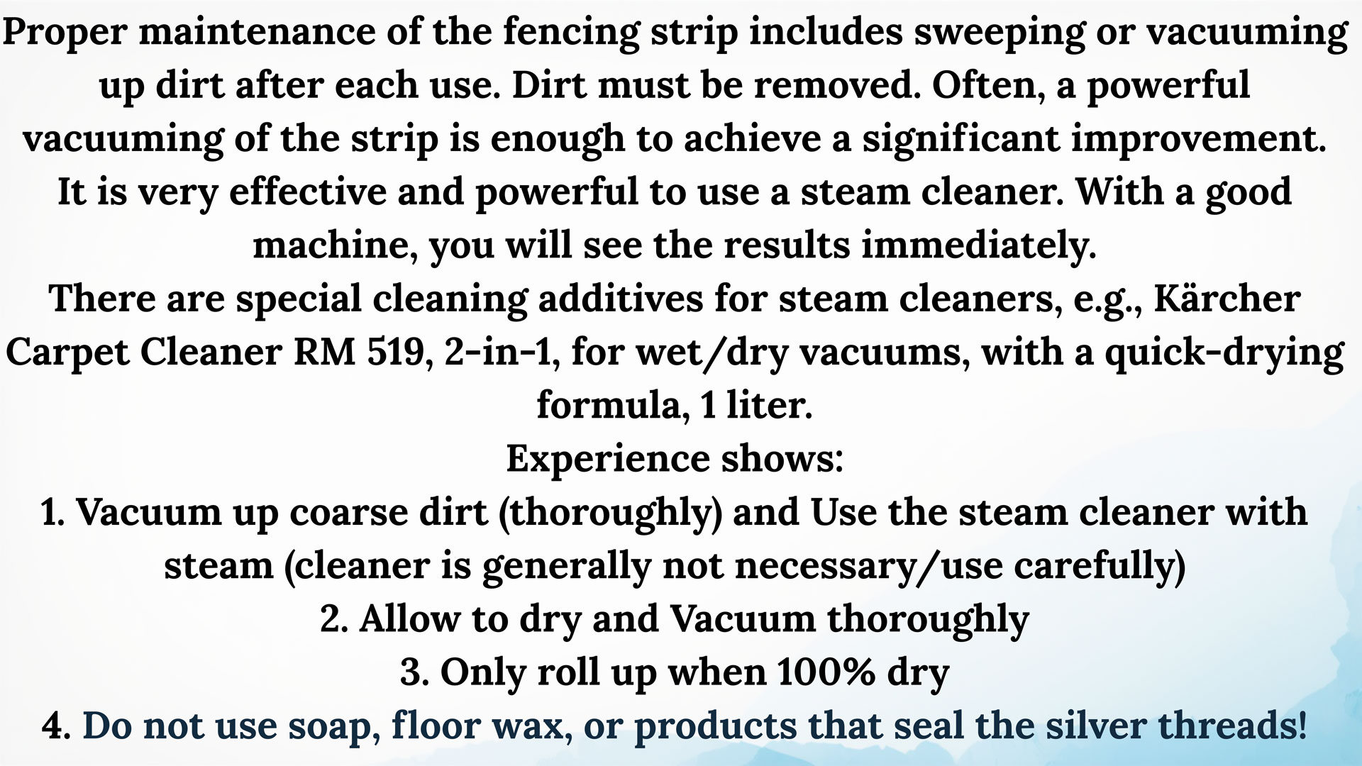 - Textile fencing pistes must only be used on dry and clean surfaces to minimize the risk of slipping.